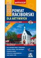 Mapa powiatu raciborskiego, w skład którego wchodzą gminy: Racibórz, Kornowac, Nędza, Kuźnia Raciborska, Rudnik, Pietrowice Wielkie, Krzanowice, Krzyżanowice. Szczególnie atrakcyjne miejsca zaznaczono żółtą ramką. Podano aktualne przebiegi szlaków pieszych, rowerowych i dydaktycznych, łącznie z kilometrażem, co pozwala łatwiej zaplanować wycieczkę. Za pomocą wyraźnych, charakterystycznych znaków wskazano miejsca, gdzie można aktywnie spędzić wolny czas. Na mapie zaznaczono miejscowości, drogi, lokalizację nowopowstającej autostrady, zabytki, ważniejsze noclegi, łowiska, stadniny koni, pola golfowe, parki linowe, boiska do siatkówki plażowej, tereny narciarskie, przystanie żeglarskie, korty tenisowe, strzelnice sportowe, hale sportowe oraz kąpieliska i baseny. Ukształtowanie terenu pokazano przy pomocy warstwic o cięciu co 10 m.