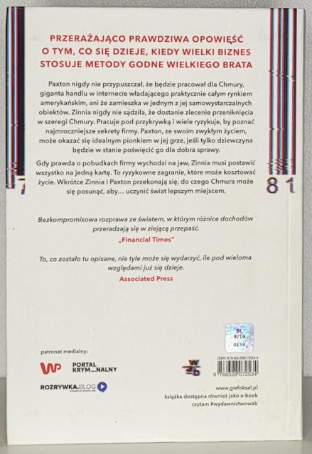 Przerażająco prawdziwa powieść o tym, co się dzieje, kiedy Wielki Biznes stosuje metody godne Wielkiego Brata. Oraz o tym, kto zapłaci za to najwyższą cenę. Paxton nigdy nie sądził, że będzie pracował dla Clouda, gigantycznej firmy technologicznej, która włada praktycznie całym rynkiem amerykańskim, oraz że przeprowadzi się do jednego z jej rozległych obiektów. Szczególnie, że życie w środowisku Clouda – z salami rozrywkowymi, otwartymi przestrzeniami biurowymi i w ogromnych magazynach – jest lepsze niż to, co pozostało na zewnątrz. To znacznie więcej, niż zapewnia ktokolwiek inny. Zinnie udało się przeniknąć w szeregi Clouda, gdzie pracuje pod przykrywką. Wiele ryzykuje, by wykraść najcenniejsze tajemnice firmy. Paxton ze swoim zwykłym życiem, małymi nadziejami i obawami może okazać się idealnym pionkiem w tej grze, jeśli tylko Zinnia będzie w stanie poświęcić go dla dobra sprawy. Gdy prawda o pobudkach firmy wychodzi na jaw, kobieta musi postawić wszystko na jedną kartę. To ryzykowne zagranie, które może kosztować życie. Wspólnymi siłami Zinnia i Paxton dowiedzą się, do czego Cloud może się posunąć.