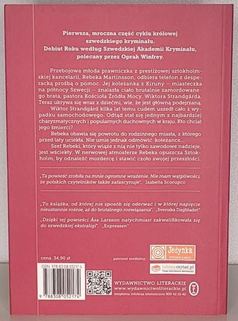 Pierwsze śledztwo Rebeki Martinsson W świątyni zboru Źródła Mocy zostaje bestialsko zamordowany Wiktor Strandgard, aktywny działacz religijny. Zmasakrowane zwłoki znajduje siostra ofiary, która niezwłocznie zawiadamia policję i… znika. Rytualny mord? Walka o wpływy w zborze? Prywatne porachunki? W śledztwo angażuje się komisarz Anna Maria Mella. W tym samym czasie w Kirunie pojawia się Rebeka Martinsson, prawniczka ze Sztokholmu, którą jeden telefon zmusił do powrotu w rodzinne strony. Wkrótce zaczynają wychodzić na jaw mroczne tajemnice rodzin pastorów… Burza słoneczna to pierwsza, najbardziej osobista książka Asy Larsson — bestsellerowej pisarki, trzykrotnie wyróżnionej przez Szwedzką Akademię Kryminału.Dotychczas brakująca część serii o Rebece Martinsson, w którą na potrzeby ekranizacji wcieliła się Izabella Scorupco. Światowy bestseller, polecany przez Oprah Winfrey — autorkę zestawienia „Kryminały, które każda myśląca kobieta powinna przeczytać”. Jeśli chcesz dowiedzieć się prawdy o autorce, przeczytaj jej pierwszą książkę. Asa Larsson Prawdziwej przyjemności dostarcza szczegółowy opis tego zimnego, ciemnego i obcego świata. Oprah.com To książka, od której nie sposób się oderwać i w której napięcie nieustannie rośnie, aż do brutalnego rozwiązania. „Svenska Dagbladet”