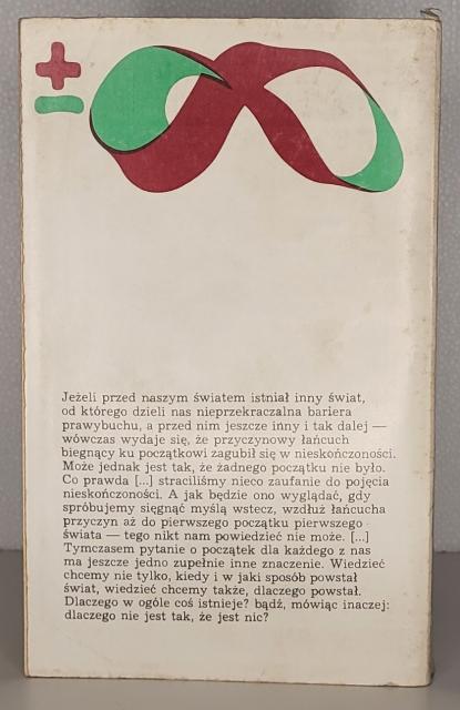Jeżeli przed naszym światem istniał inny świat, od którego dzieli nas nieprzekraczalna bariera prawybuchu, a przed nim jeszcze inny i tak dalej - wówczas wydaje się, że przyczynowy łańcuch biegnący ku początkowi zagubił się w nieskończoności. Może jednak jest tak, że żadnego początku nie było. Co prawda [...] straciliśmy nieco zaufanie do pojęcia nieskończoności. A jak będzie ono wyglądać, gdy spróbujemy sięgnąć myślą wstecz, wzdłuż szeregu przyczyn aż do pierwszego początku pierwszego świata - tego nikt nam powiedzieć nie może.