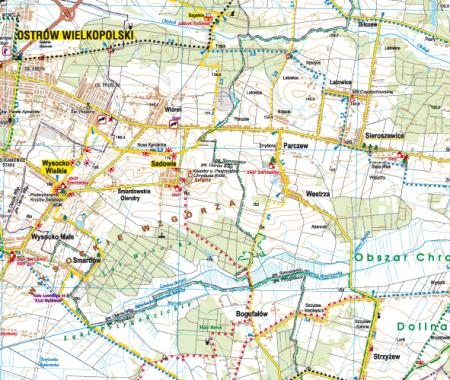 Pierwsza strona to mapa powiatu ostrowskiego w skali 1:70 000 w skład którego wchodzą gminy: Ostrów Wielkopolski, Nowe Skalmierzyce, Odolanów, Raszków, Przygodzice, Sieroszewice, Sośnie. Szczególnie atrakcyjne miejsca zaznaczono żółtą ramką. Podano aktualne przebiegi szlaków pieszych, rowerowych i dydaktycznych, łącznie z kilometrażem, co pozwala łatwiej zaplanować wycieczkę. Za pomocą wyraźnych, charakterystycznych znaków wskazano miejsca, gdzie można aktywnie spędzić wolny czas. Na mapie zaznaczono miejscowości, drogi, lokalizację nowopowstającej obwodnicy Ostrowa Wielkopolskiego, zabytki, ważniejsze noclegi, łowiska, stadniny koni, parki linowe, przystanie żeglarskie, korty tenisowe, strzelnice sportowe, hale sportowe oraz kąpieliska i baseny. Ukształtowanie terenu pokazano przy pomocy warstwic o cięciu co 10 m.
