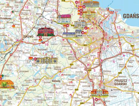 Mapa przedstawia zamki oraz ciekawsze pałace i dwory województwa pomorskiego. Podzielono je na odrestaurowane i zniszczone. Zaznaczono również obiekty, które można zwiedzać, te w których są hotele, inne obiekty noclegowe i restauracje. 120 z nich przedstawiono za pomocą ilustracji. Dodatkowo wzdłuż dróg wprowadzono kilometraż aby łatwiej można było zaplanować swoją podróż. Na drugiej stronie umieszczono obszerny opis wybranych budowli (120 obiektów) wraz z fotografiami. Mapa została wydana w dwóch wersjach językowych – polskiej i angielskiej.Składana mapa województwa pomorskiego z aktualną siecią dróg. Zaznaczono na niej, za pomocą ilustracji, zamki, pałace oraz dwory. Łącznie 121 miejsc wartych odwiedzenia.